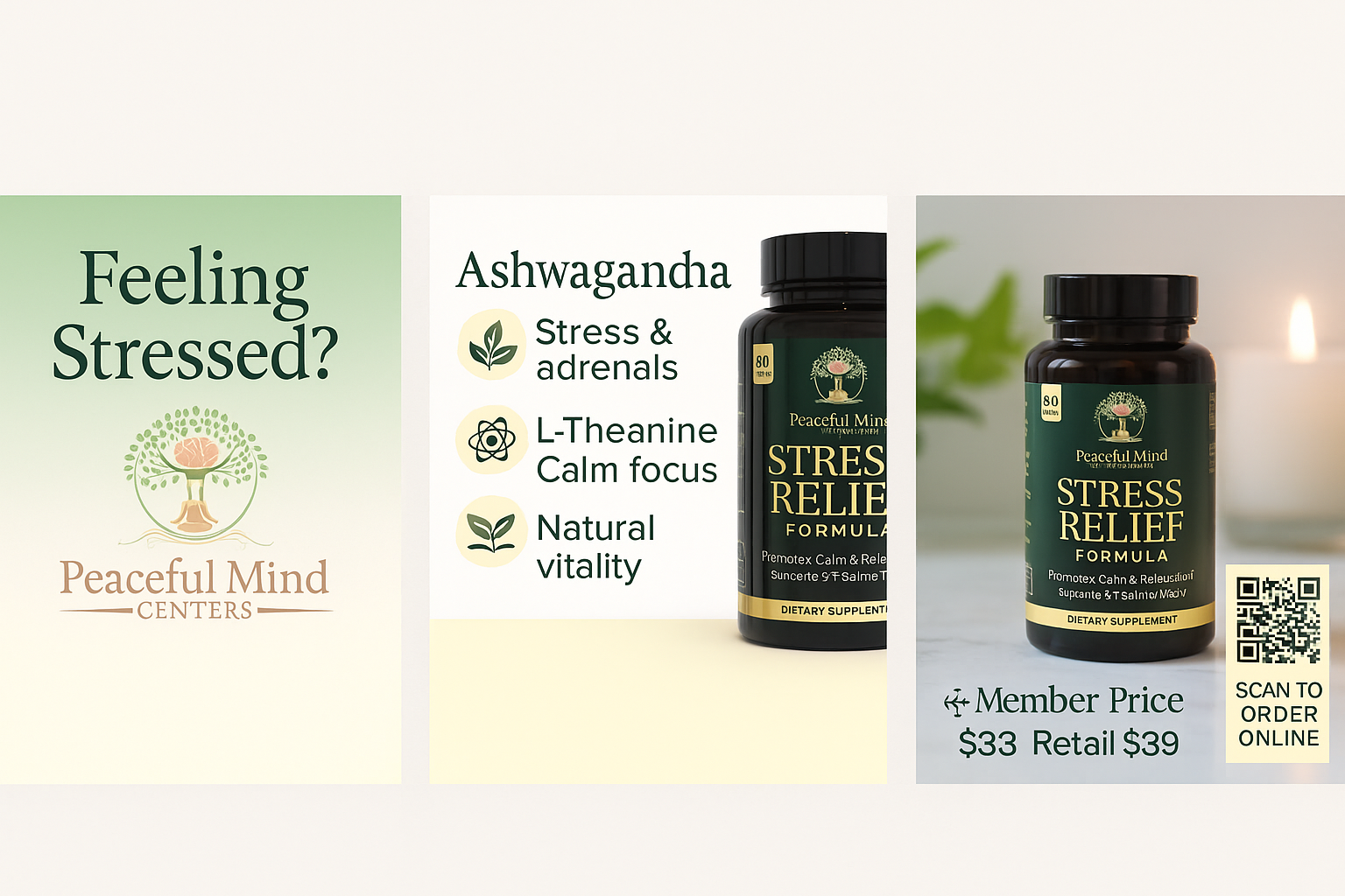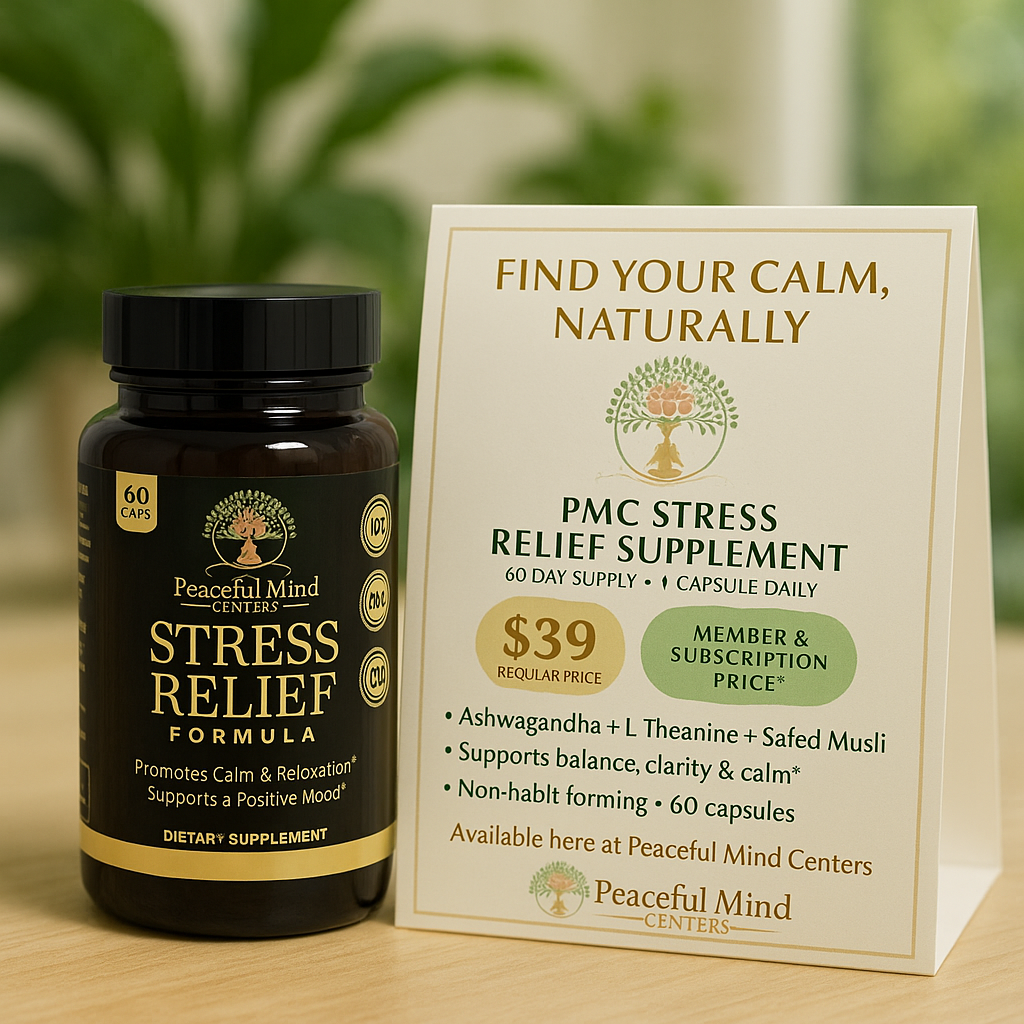 Stress Relief Formula – Ashwagandha (300mg) + L-Theanine (200mg) + Safed Musli (100mg) – Calm, Focus & Balance – 60 Capsules – Peaceful Mind Centers Clinician-Formulated Stress Support – Created by Peaceful Mind Centers’ wellness practitioners, combining ancient herbs and modern science for natural calm. Calm Focus Without Drowsiness – Ashwagandha + L-Theanine help reduce everyday stress while supporting mental clarity and balanced energy. Premium Quality, Lab-Tested Ingredients – Each capsule is manufactured in a GMP-certified facility and third-party tested for purity and potency. Mind-Body-Soul Wellness – Supports resilience, relaxation, and energy so you can stay centered through busy days. Trusted by Peaceful Mind Centers – From our Beverly Hills holistic wellness center to your home, bringing luxury wellness supplements you can trust. At Peaceful Mind Centers, we believe true wellness means balance in mind, body, and soul. Our Stress Relief Supplement is carefully formulated to help you stay calm, focused, and energized — naturally. - Ashwagandha (300mg): Adaptogenic herb that supports stress reduction and adrenal health. - L-Theanine (200mg): Amino acid known for promoting calm alertness and focus without sedation. - Safed Musli (100mg): Ayurvedic herb that restores energy, stamina, and vitality. ✔ Clinician formulated at Peaceful Mind Centers ✔ Third-party lab tested ✔ Non-habit forming, gentle, and effective ✔ Easy-to-swallow vegetarian capsules bring the peace of our wellness studio home with you.